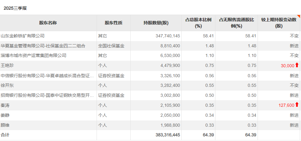 社保基金四二二组合三季度新进金岭矿业前十大流通股股东名单,持股数量为881万股,位居第二大流通股股东。