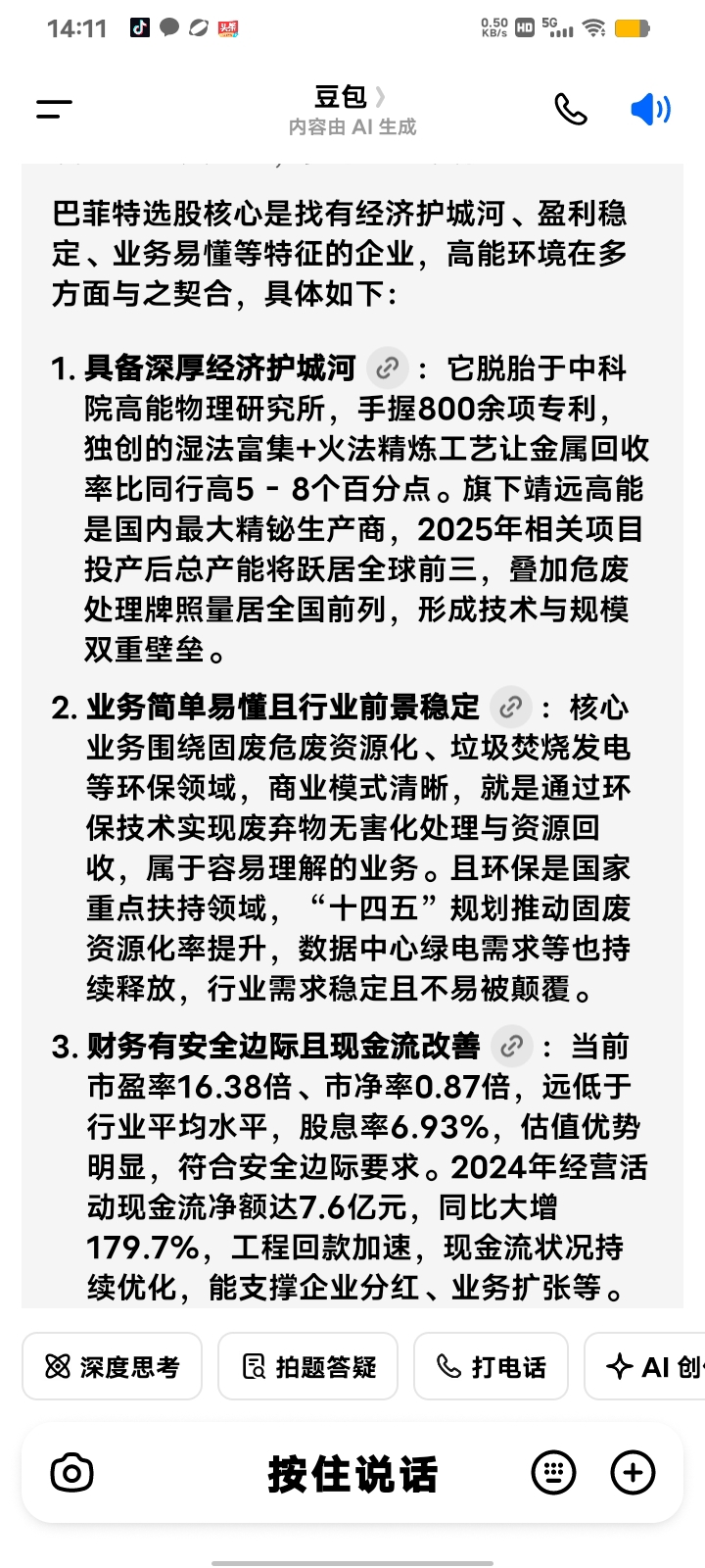 $高能环境(SH603588)$ 投资不易,本人想选一个有前景,风险小,经营稳定的公司,针对高能按巴菲特的标准我问了一下豆包,欢迎大家探讨,