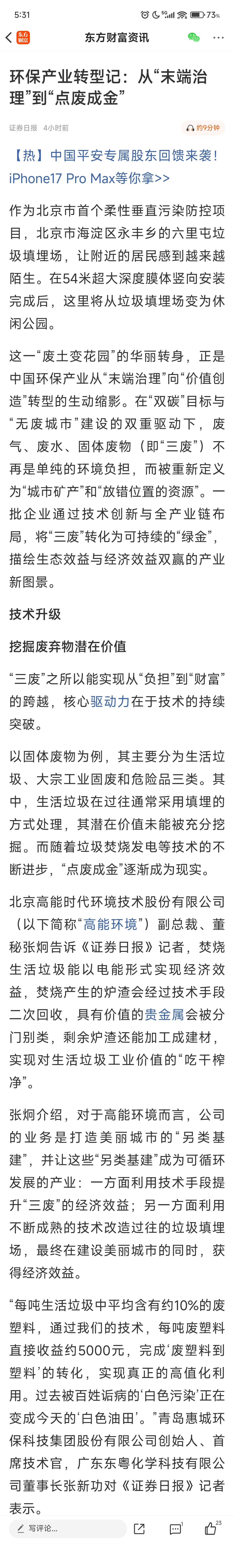 $高能环境(SH603588)$ 政策落地各项环保利好。和清交拖欠的企业欠款,高能环境21亿元未收款,有望加速收回,向全球布局扩张城市里的矿山银山。变废为宝发电供热,稀有贵金属和再生塑料,绿色建材砖。