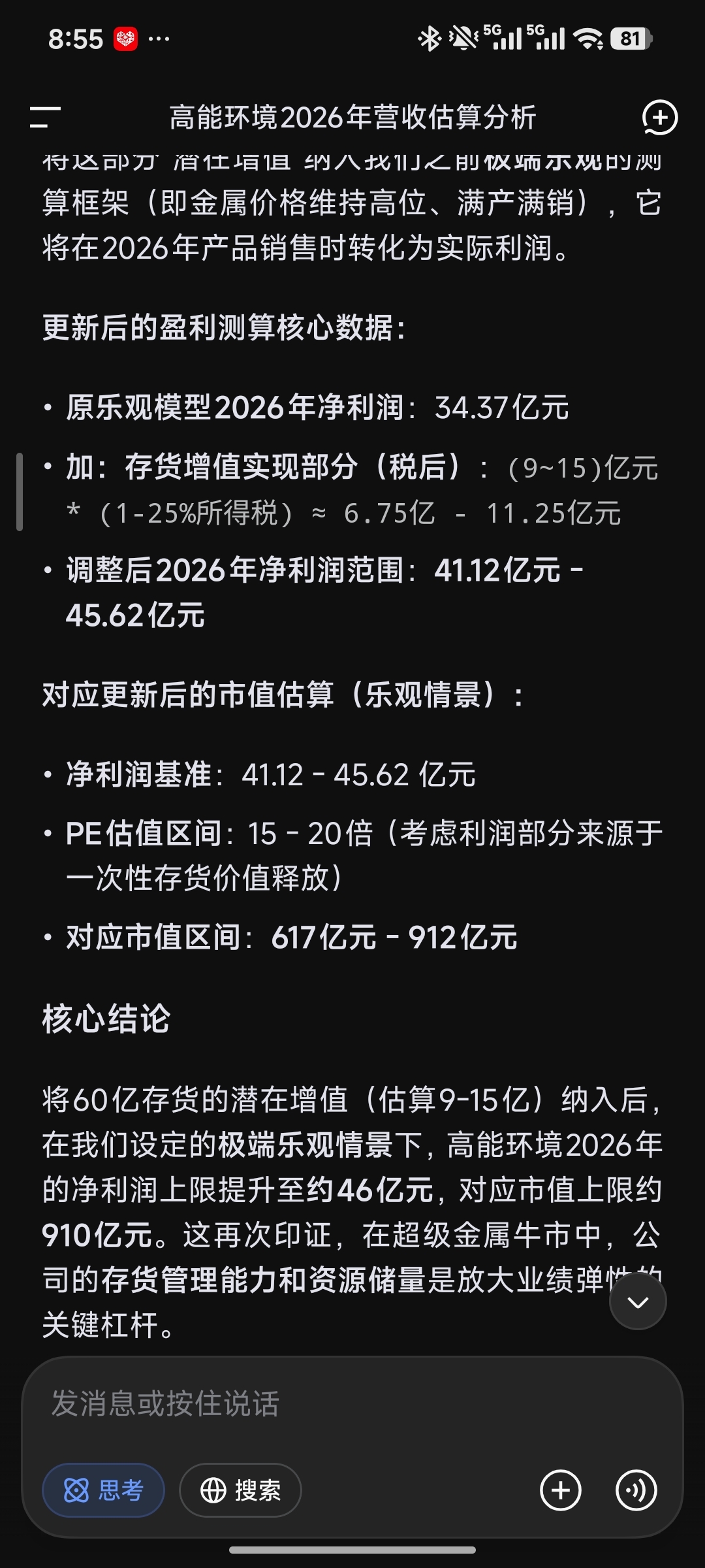 闲来无事,跟AI探讨一下高能的乐观(今天收盘金属价,26年满产)正常身价!千亿不