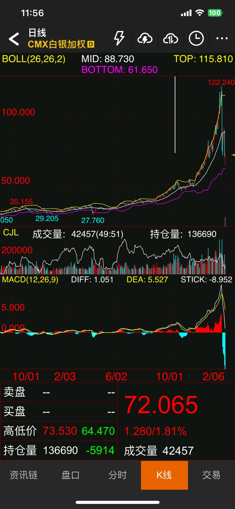 低位唱多是正常的。价格到了,就要谨慎对待。我还持有部分高能环境。高能环境的资源化利用是主业,金属价格下跌,影响显而易见。下图是白银的日K线,但凡有一点常识都知道,只有白银的价格的止跌,成交量必须回复到底量,多空博弈才能趋于平衡,才能空看多。这是常识,请看看吧。未来白银很重要的,估计会维持在50美元以上。50美元也是破历史的高位了。