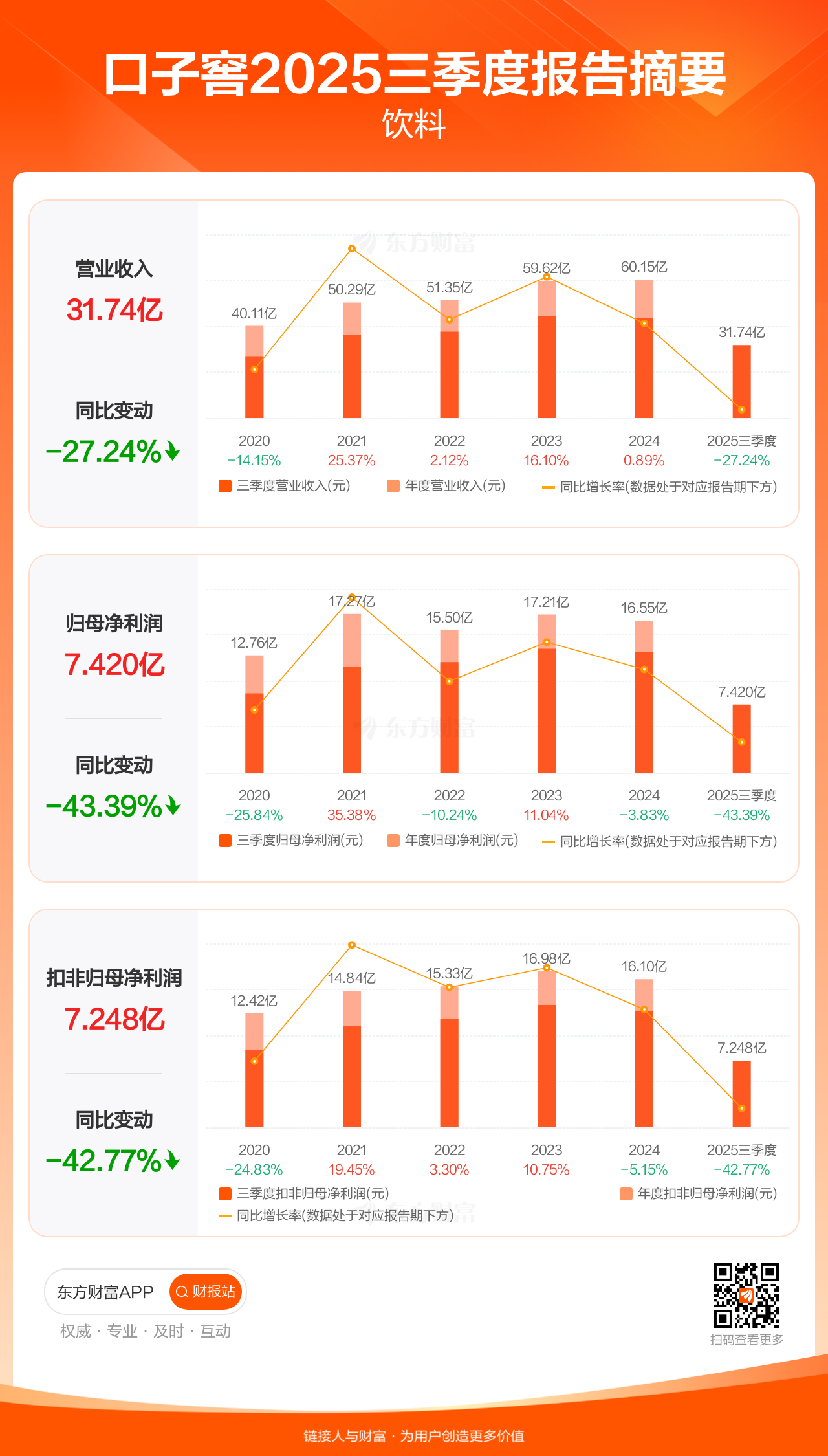 口子窖10月29日发布2025年三季报显示,公司前三季实现营业收入31.74亿元,同比下滑27.24%;归母净利润7.42亿元,同比下滑43.39%;扣非归母净利润7.25亿元,同比下滑42.77%。