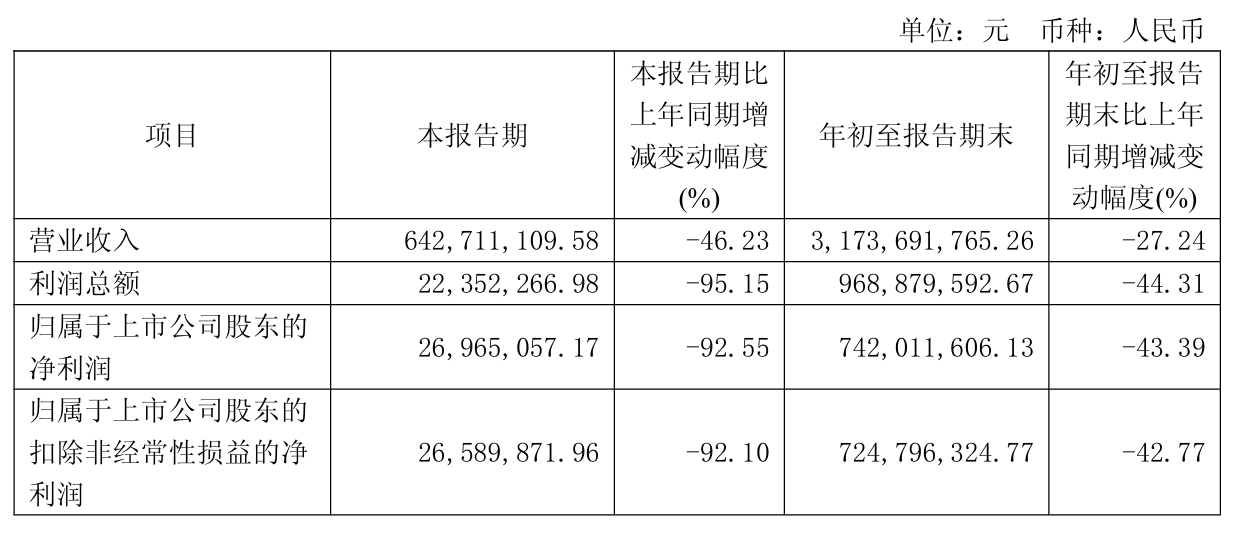 10月28日晚间,口子窖(SH 603589)发布三季度业绩公告称,2025年前三季度营收约31.74亿元,同比减少27.24%;归属于上市公司股东的净利润约7.42亿元,同比减少43.39%。