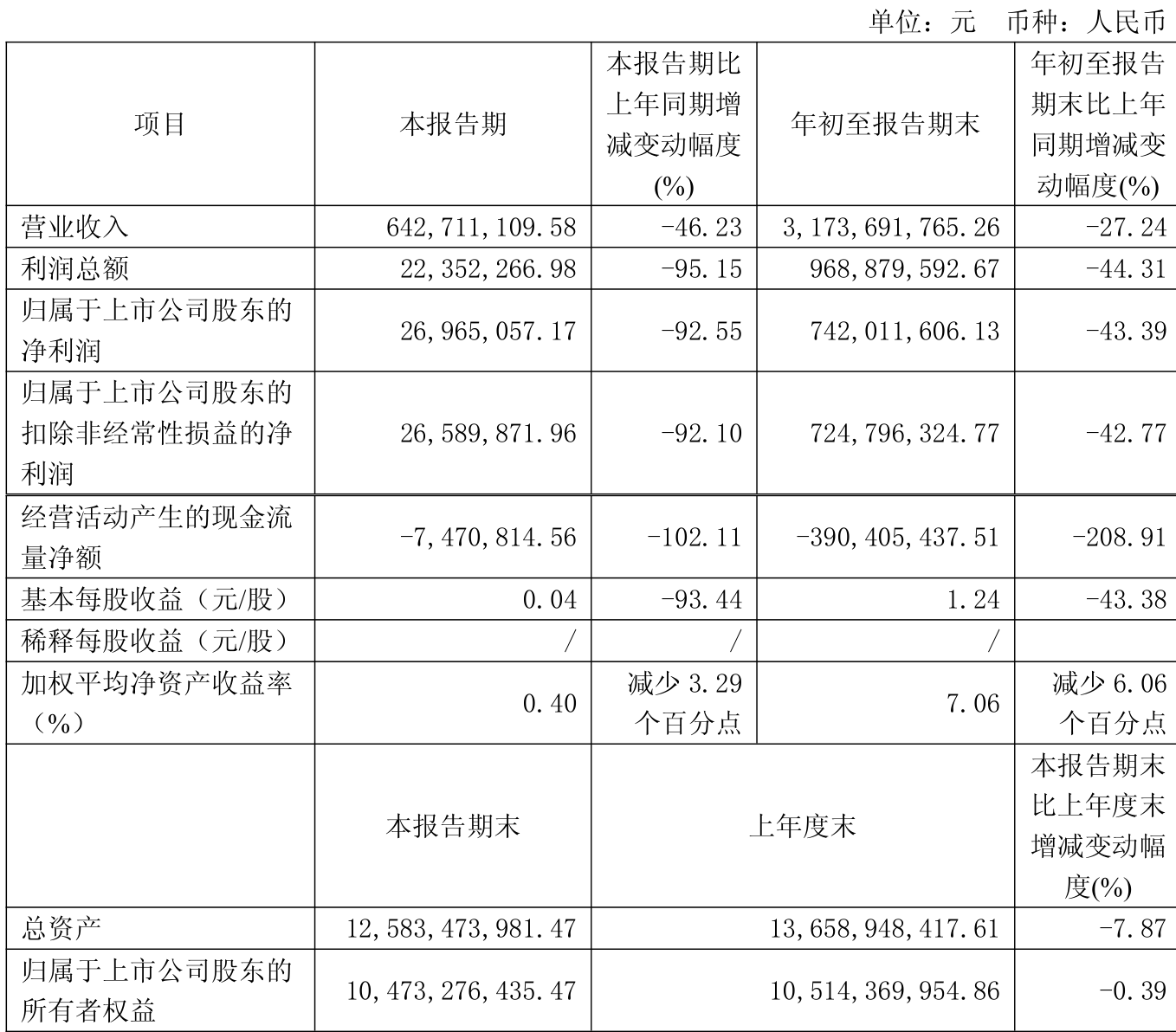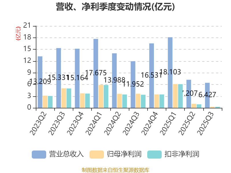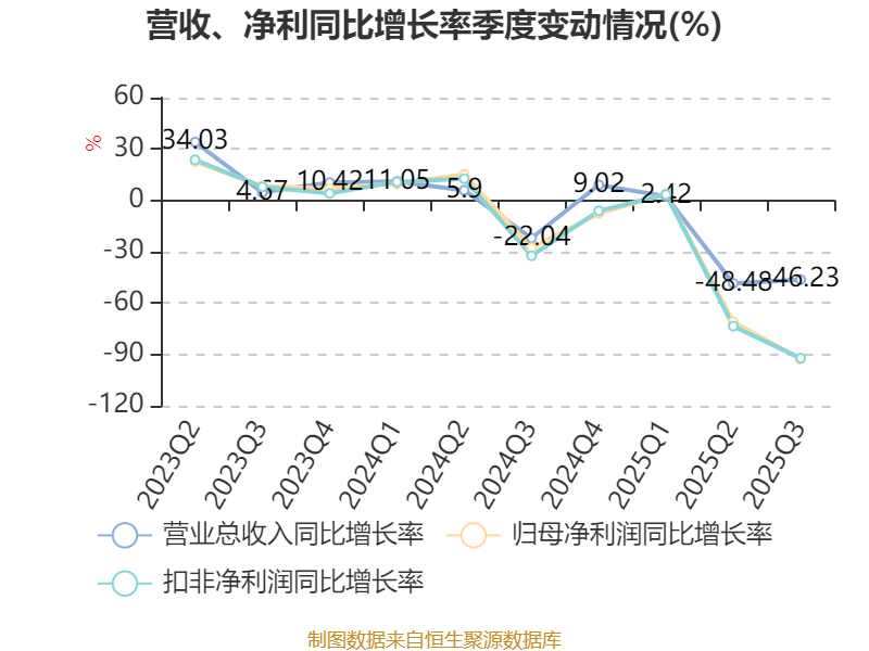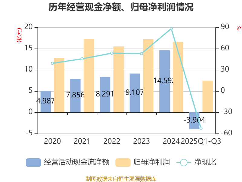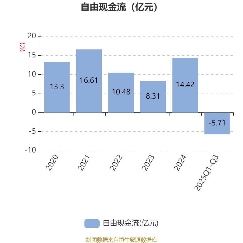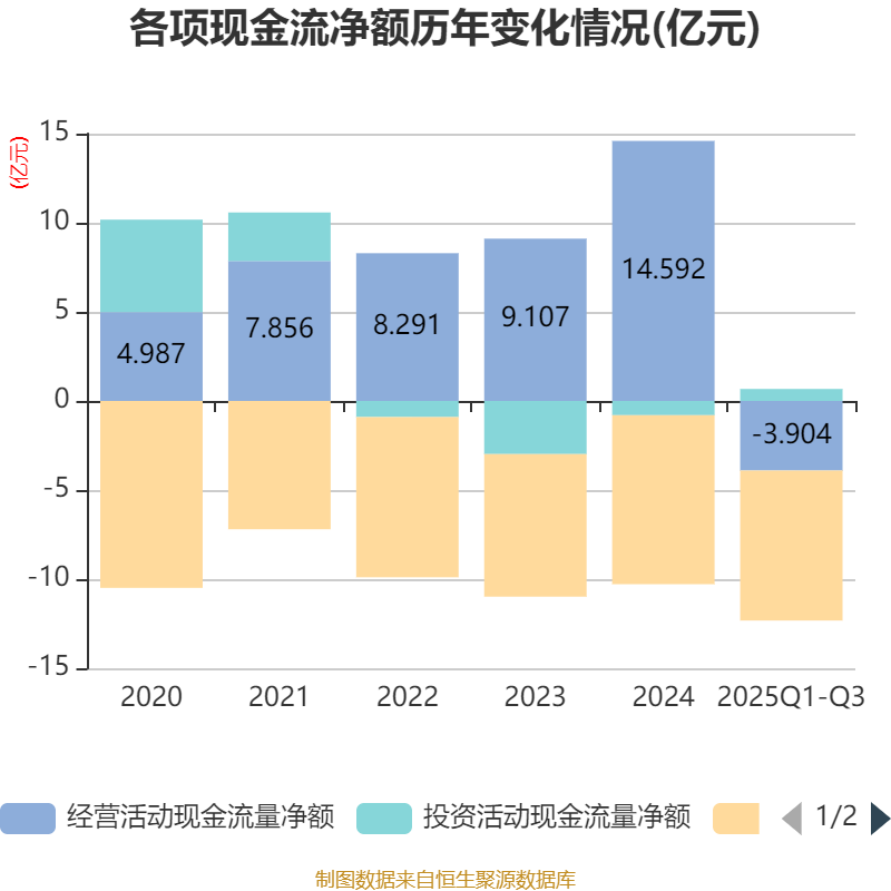 2025年前三季度,公司经营活动现金流净额为-3.9亿元,同比减少7.49亿元;筹资活动现金流净额-8.42亿元,同比增加1.02亿元;投资活动现金流净额6733.73万元,上年同期为4.27亿元。