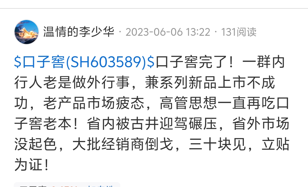 $口子窖(SH603589)$ 新品上市猛如虎,头被撞得血如注。迎驾古井坚如墙,打得口子直叫娘。业务个个似豺狼,吃拿卡要心不慌。口子老牌远名扬,残羹剩饭今下场。