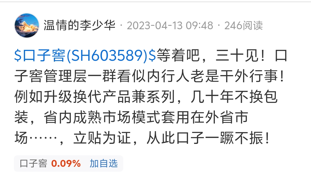 套牢亏钱怪不得别人,早在三年前我就预料到口子窖走下坡路,要倒闭或者被收购……