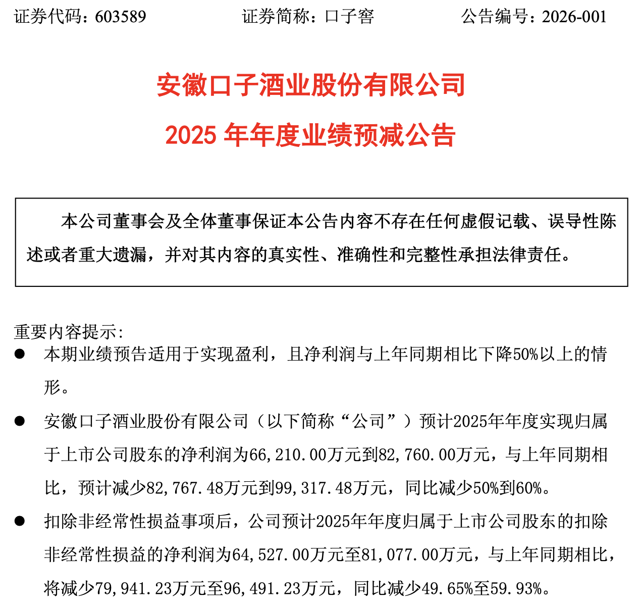 高端酒卖不动,口子窖2025年净利润预计迎来“腰斩”,或是其上市以来最大的净利跌幅。