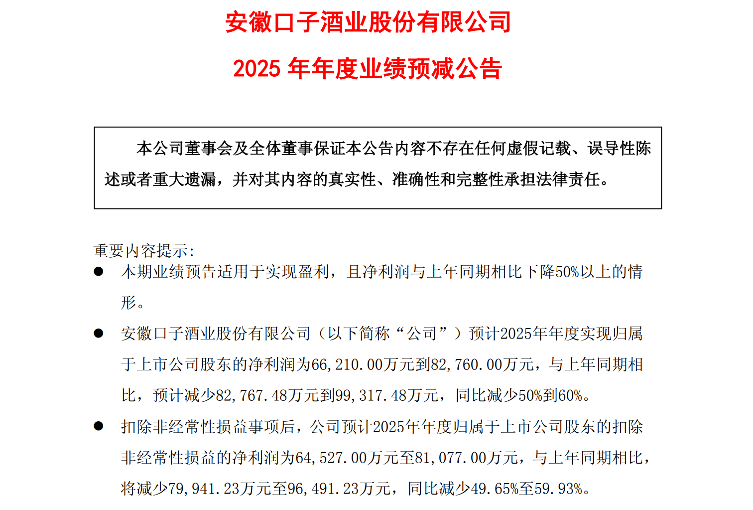 口子窖发布的业绩预告显示,公司预计2025年实现归属于上市公司股东的净利润为6.6亿元到8.3亿元,与上年同期相比,减少50%到60%;扣除非经常性损益的归属净利润为6.5亿元至8.1亿元,同比减少49.65%至59.93%。