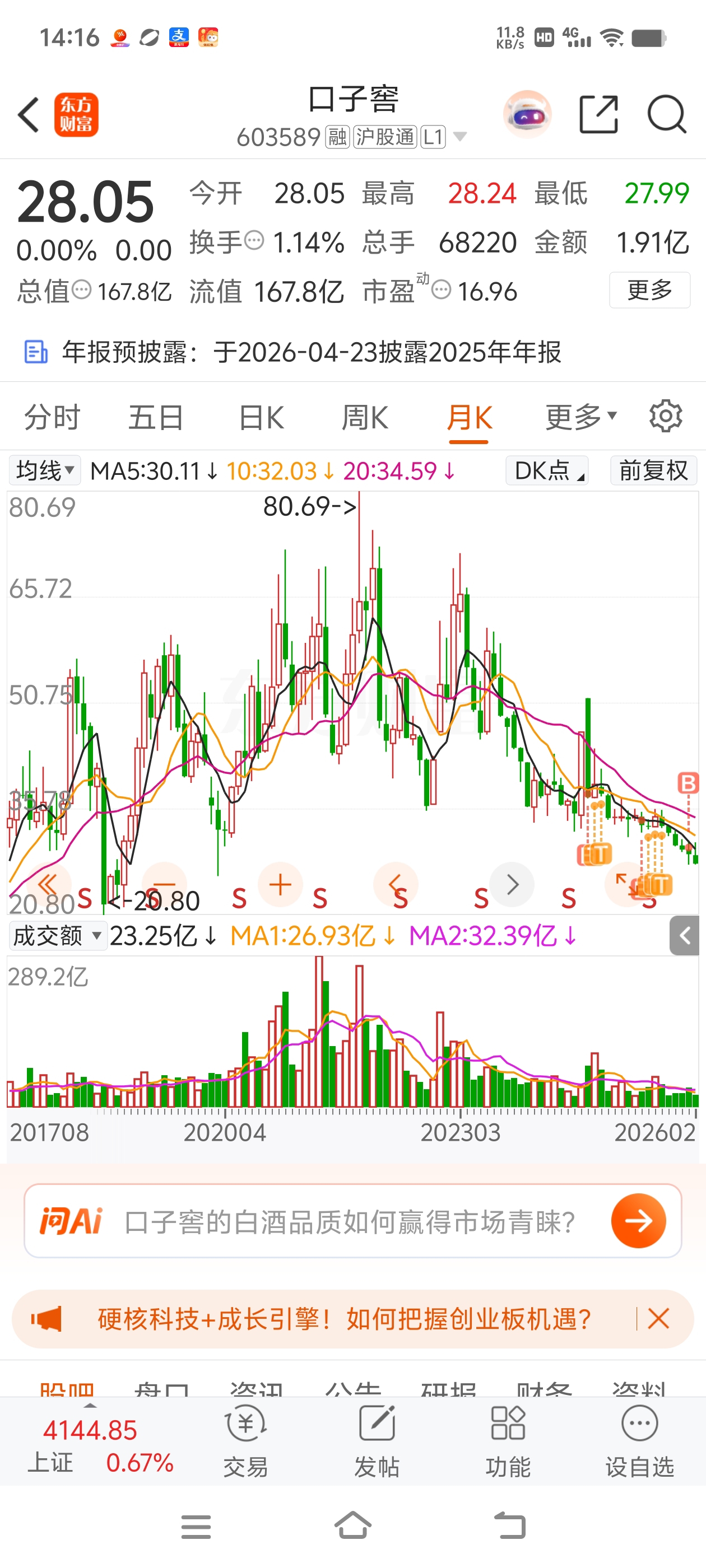 $口子窖(SH603589)$ 一年多了,哎
