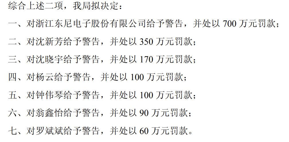 浙江证监局对公司的违规信披和财务造假数罪并罚。其决定,对东尼电子给予警告,并处以700万元罚款。同时,对时任董事长沈新芳、时任总经理沈晓宇、时任财务总监杨云和钟伟琴、时任董事会秘书翁鑫怡、时任副总经理罗斌斌给予警告,并分别罚款350万元、170万元、100万元、100万元、90万元和60万元。