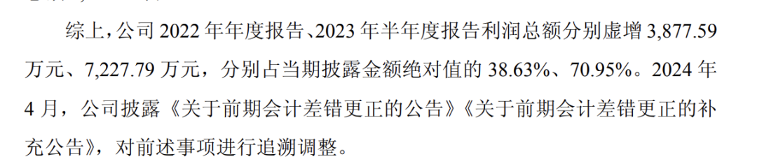 综上所述,公司2022年年度报告、2023年半年度报告利润总额分别虚增3877.59万元、7227.79万元,分别占当期披露金额绝对值的38.63%、70.95%。2024年4月,公司已披露了《关于前期会计差错更正的公告》《关于前期会计差错更正的补充公告》,并对前述事项进行追溯调整。