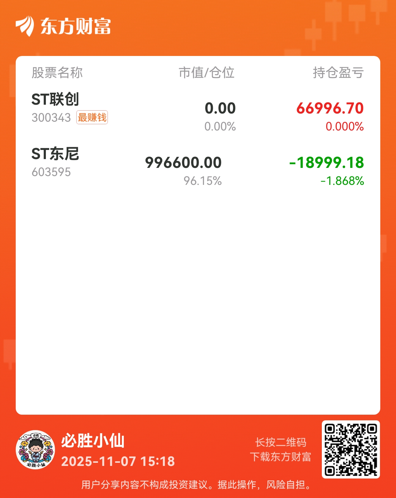 $ST东尼(SH603595)$ $ST股(BK0511)$ $上证指数(SH000001)$ 亲,好好一个周末,本想套现再小赚的,居然去抄底,这下,重新开始吧,输钱不能输心情,很好的,很好的,很好的。