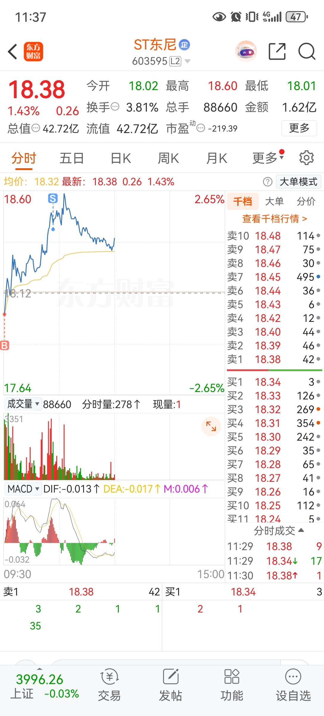 $ST东尼(SH603595)$ 昨天尾盘买入,开始做t,直到摘帽~