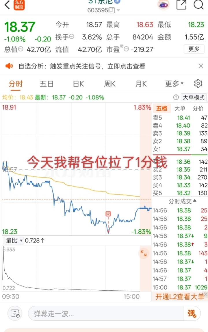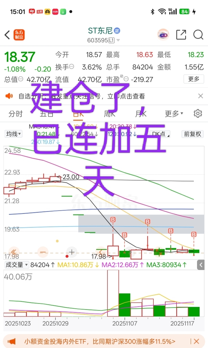 $ST东尼(SH603595)$ 11月6日进场,18.07建仓,上周慢慢逢低加一点点,不急慢慢来,反正我买ST一直都是属貔貅的,选好了就不改的那种,只进货不出货的那种。开弓没有回头箭。