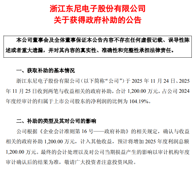 11月25日晚间,ST东尼(603595)公告,公司于2025年11月24日、2025年11月25日收到两笔与收益相关的政府补助,合计1200万元,占公司2024年度经审计的归属于上市公司股东的净利润的比例为104.19%。