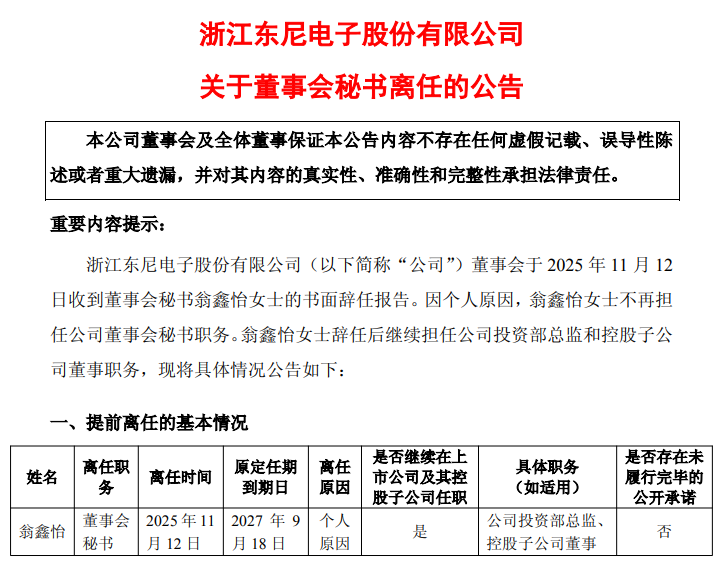 11月12日晚间,东尼电子还公告,公司收到董秘翁鑫怡的书面辞任报告。因个人原因,其不再担任公司董秘职务,辞任后继续担任公司投资部总监和控股子公司董事职务。在聘任新的董秘之前,公司董事会指定公司董事兼副总经理吴旭华代行董秘职责。
