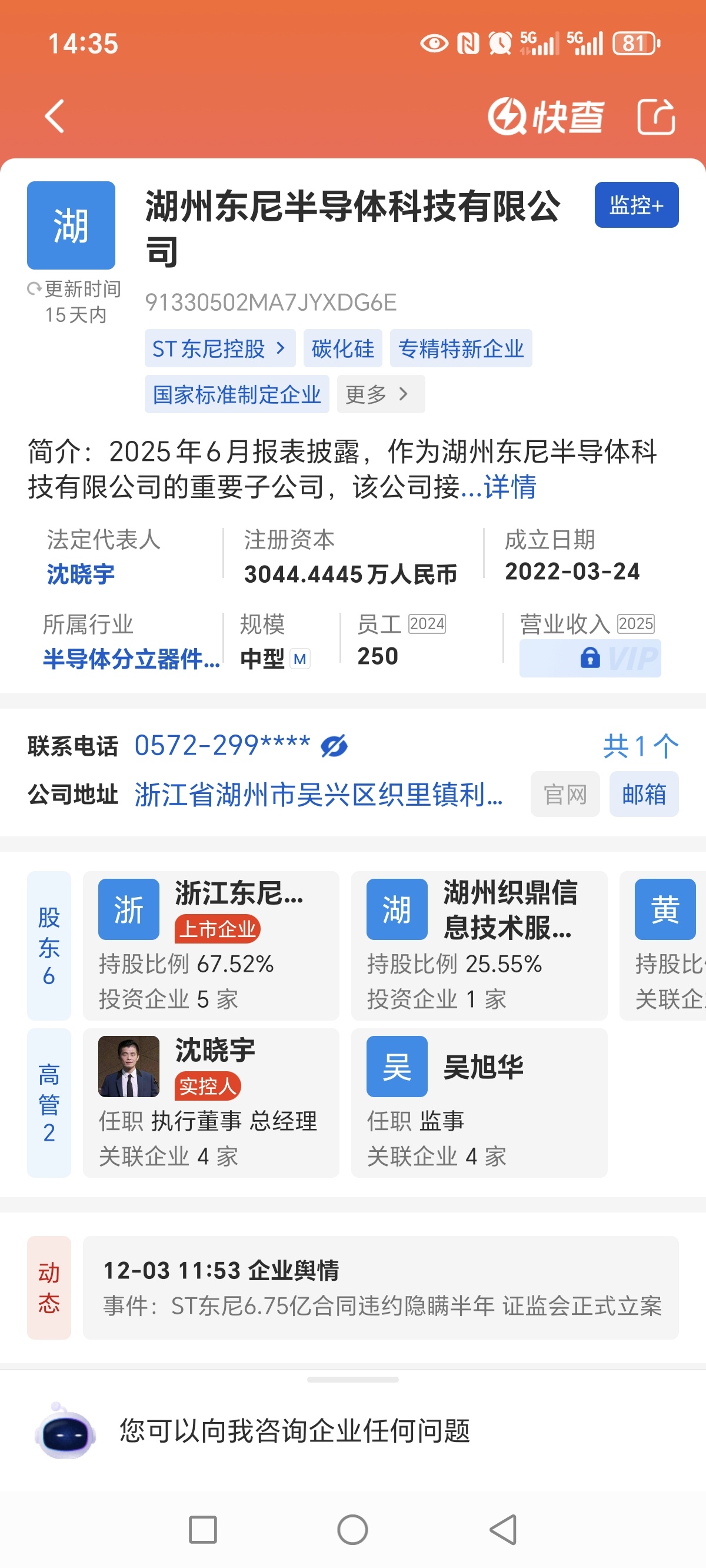 东尼半导体的股权结构来看,湖州国资持股25.55%,天域半导体可考虑把这部分股权收过来,然后再注资,一起做大做强