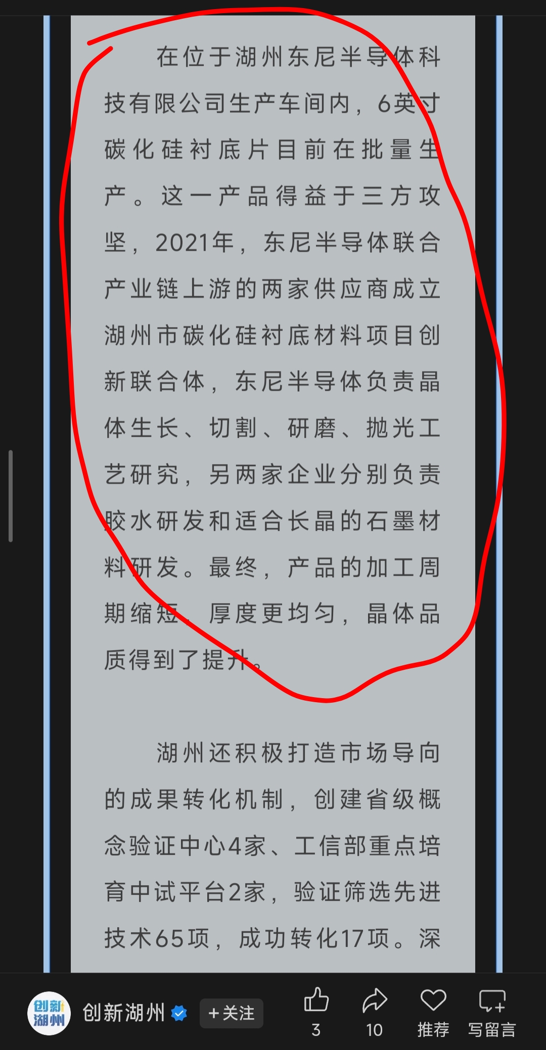 在位于湖州东尼半导体科技有限公司生产车间内,6英寸碳化硅衬底片目前在批量生产。这一产品得益于三方攻坚,2021年,东尼半导体联合产业链上游的两家供应商成立湖州市碳化硅衬底材料项目创新联合体,东尼半导体负责晶体生长、切割、研磨、抛光工艺研究,另两家企业分别负责胶水研发和适合长晶的石墨材料研发。最终,产品的加工周期缩短,厚度更均匀,晶体品质得到了提升。