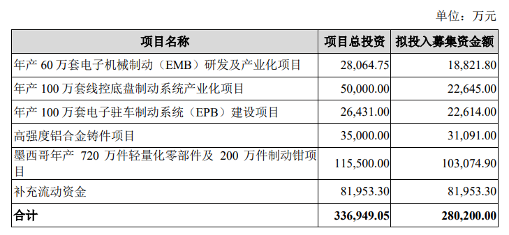 根据可转债预案(修订稿),公司拟公开发行可转债募资不超28.02亿元,扣除发行费用后将用于年产60万套电子机械制动(EMB)研发及产业化项目、年产100万套线控底盘制动系统产业化项目、年产100万套电子驻车制动系统(EPB)建设项目、高强度铝合金铸件项目、墨西哥年产720万件轻量化零部件及200万件制动钳项目,以及补充流动资金。