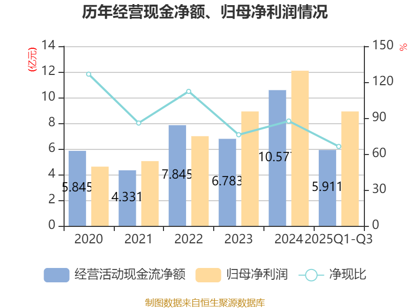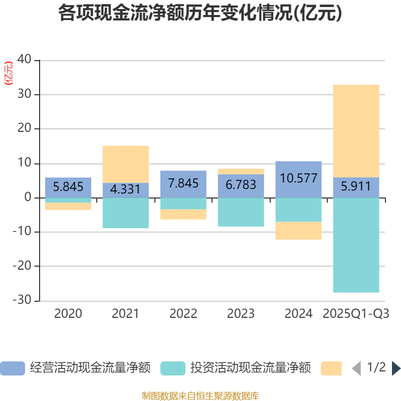 2025年前三季度,公司经营活动现金流净额为5.91亿元,同比下降4.94%;筹资活动现金流净额26.93亿元,同比增加30.08亿元;投资活动现金流净额-27.61亿元,上年同期为-3.57亿元。