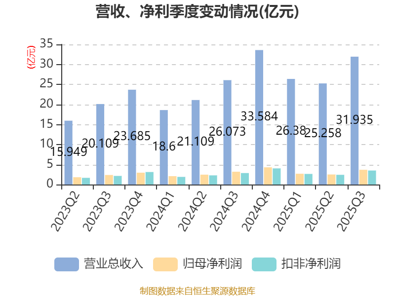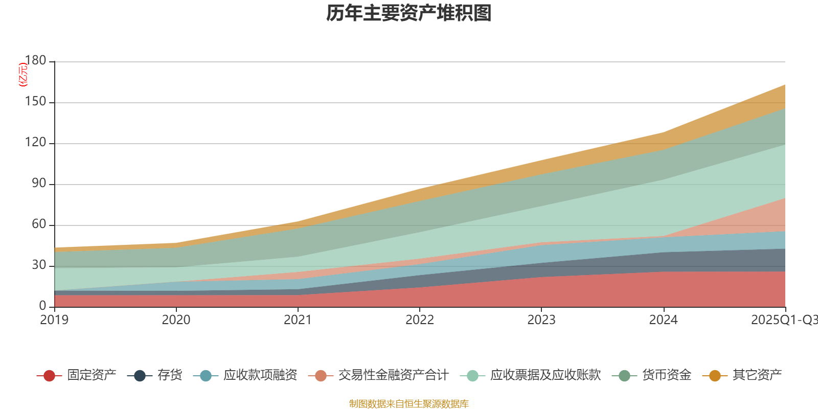 资产重大变化方面,截至2025年三季度末,公司交易性金融资产合计较上年末增加2498.85%,占公司总资产比重上升14.19个百分点;应收票据及应收账款较上年末减少5.29%,占公司总资产比重下降8.31个百分点;固定资产较上年末增加0.3%,占公司总资产比重下降4.28个百分点;在建工程合计较上年末增加56.61%,占公司总资产比重上升0.8个百分点。