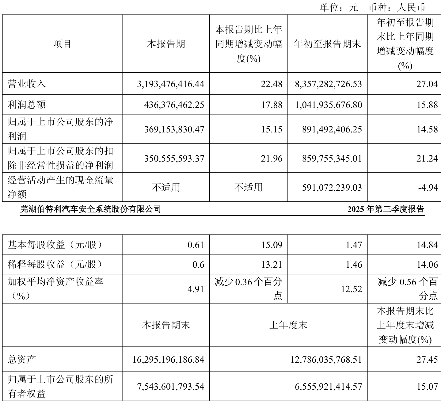 伯特利:2025年前三季度净利润8.91亿元 同比增长14.58%