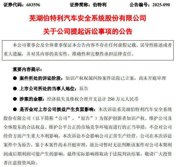 另一方面,日前,伯特利诉前任高管侵犯知识产权,引起市场广泛关注。