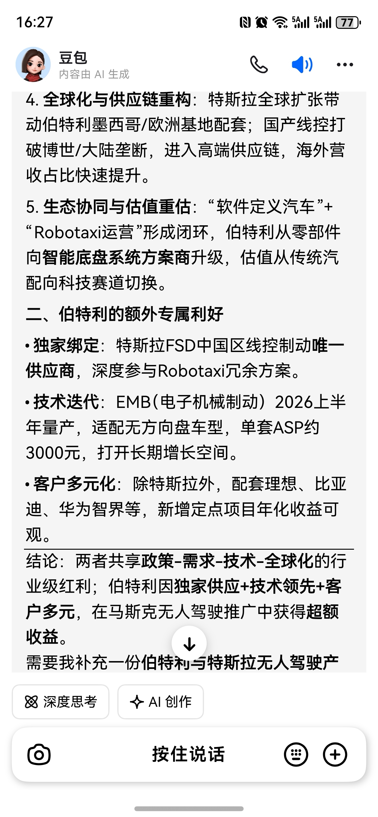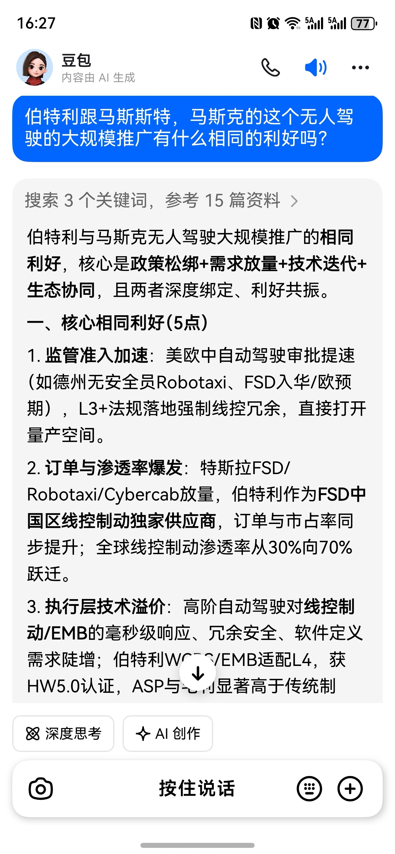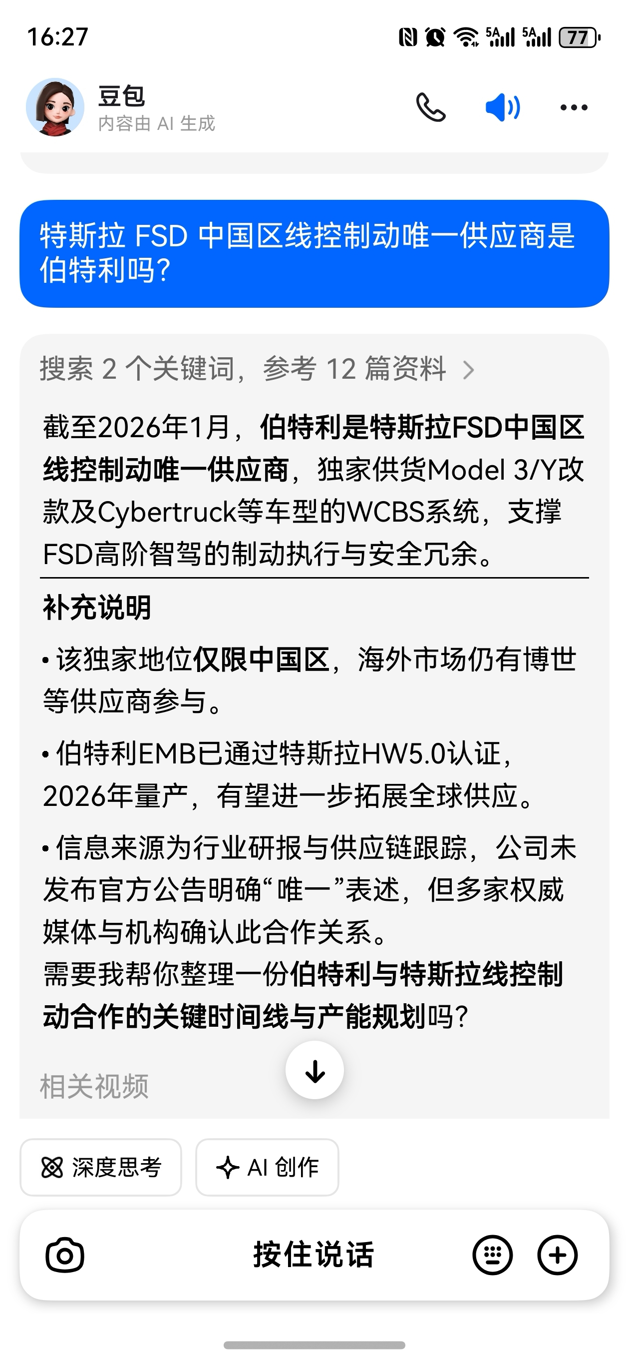 $伯特利(SH603596)$ 截至2026年1月,伯特利是特斯拉FSD中国区线控制动唯一供应商,独家供货Model 3/Y改款及Cybertruck等车型的WCBS系统,支撑FSD高阶智驾的制动执行与安全冗余。