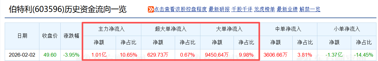 603596伯特利2026年2月2日复盘数据:(一)东方财富网资金流向显示今日主