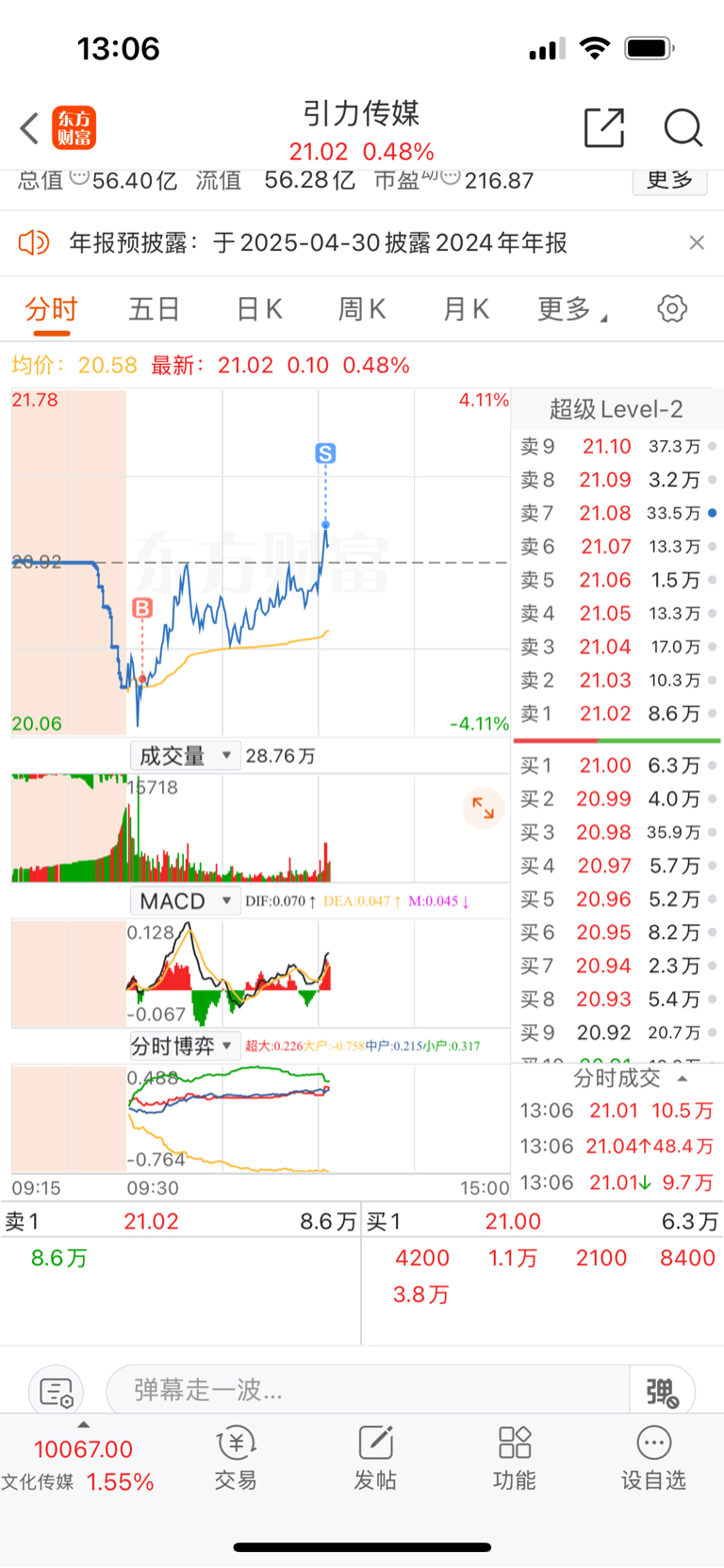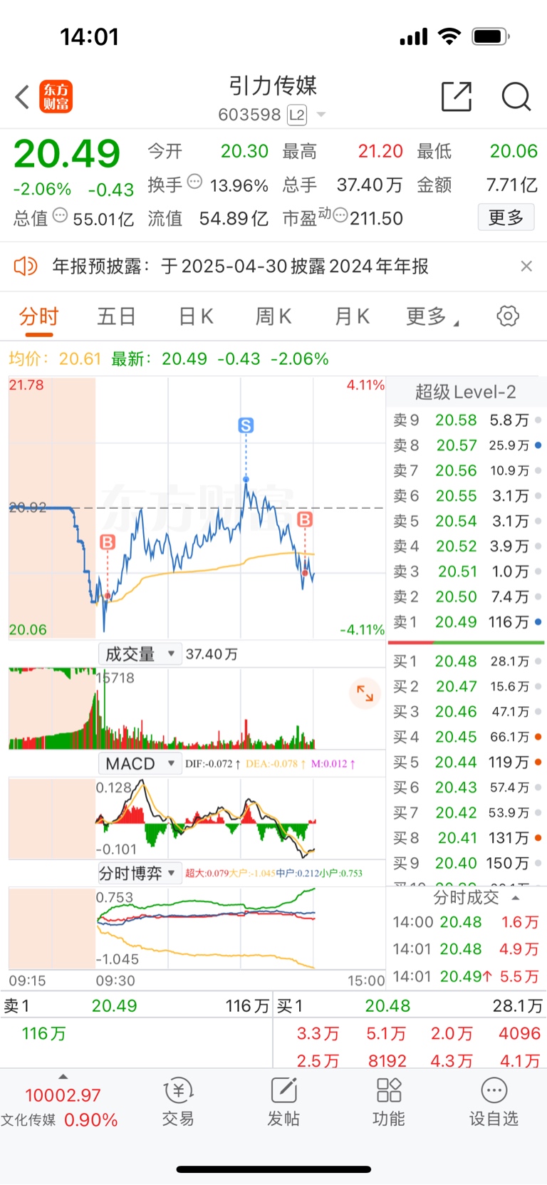 $引力传媒(SH603598)$ 唉,急涨不敢拿,卖飞也要卖