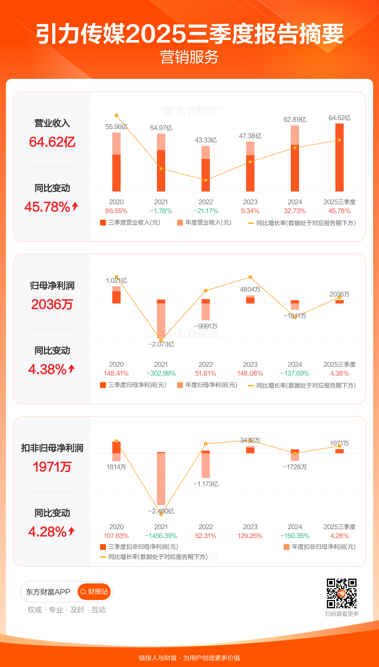引力传媒10月31日发布2025年三季报显示,公司前三季实现营业收入64.62亿元,同比增长45.78%;归母净利润2036.02万元,同比增长4.38%;扣非归母净利润1970.71万元,同比增长4.28%。