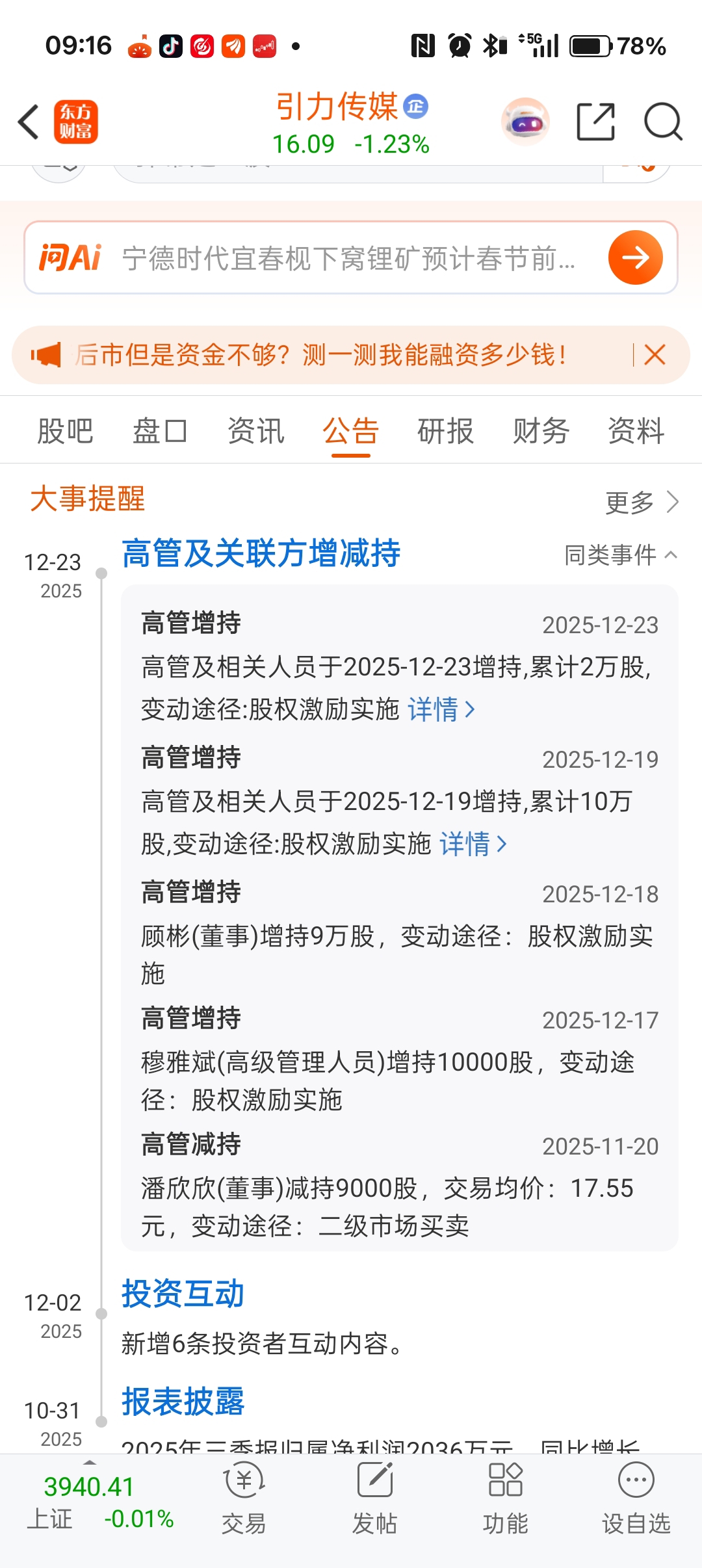 $引力传媒(SH603598)$ 12.11号下跌 是不是因为他们要增持呢 哈哈