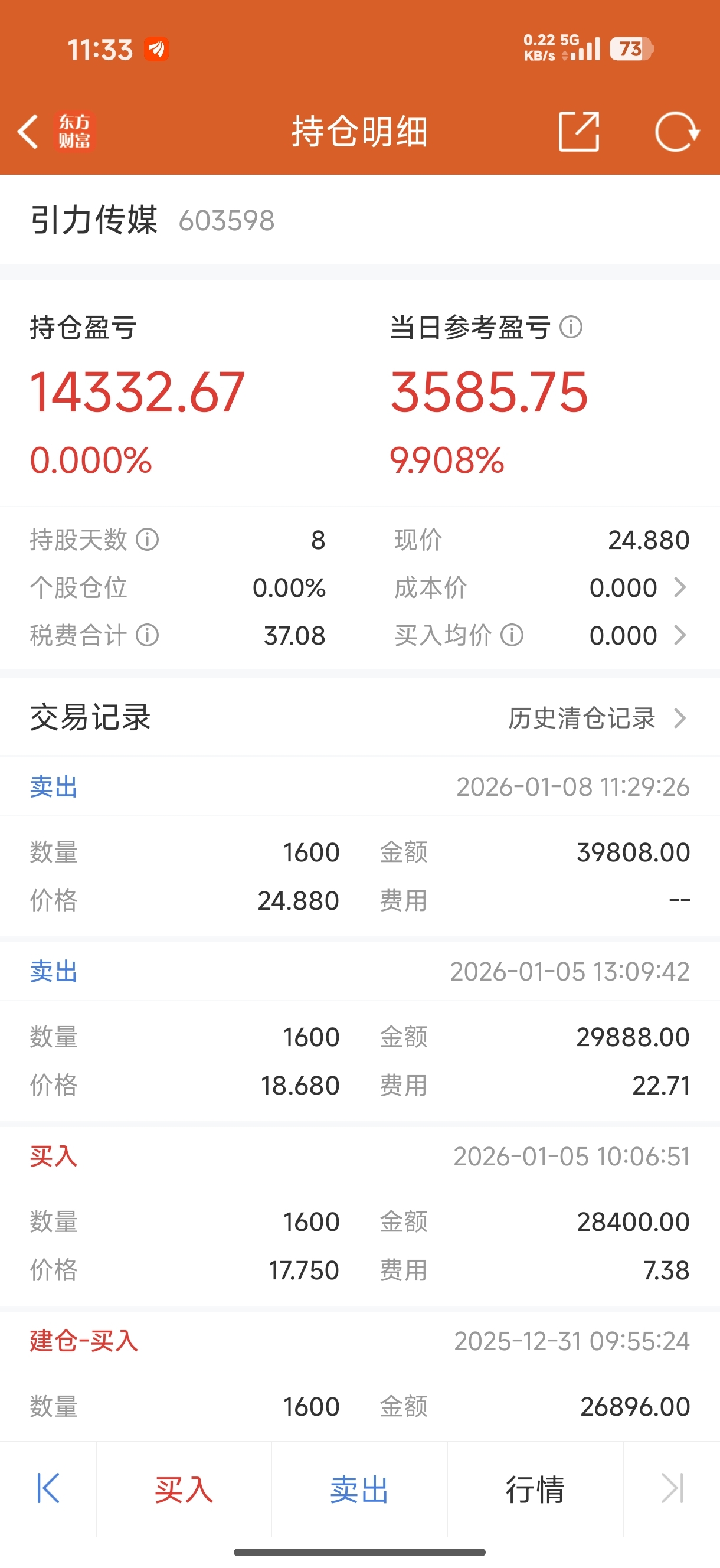 $引力传媒(SH603598)$ 我走了,感谢机构入场了,我不贪心,留下的发财