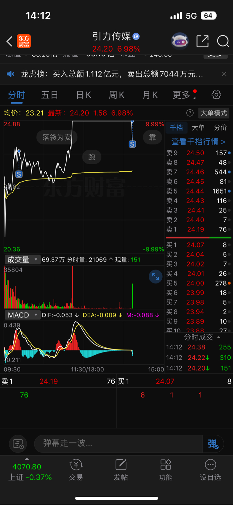 $引力传媒(SH603598)$ Are you ok?你们今天进来的还好吗?我5个点卖三分之一,后面清仓了