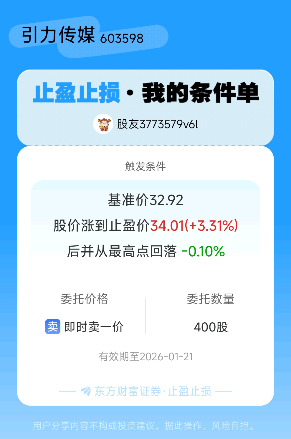 #条件单交流# #止盈止损晒单# 一位股神设置了一个止盈止损条件单,接下来就是见证奇迹的时刻~$引力传媒(SH603598)$