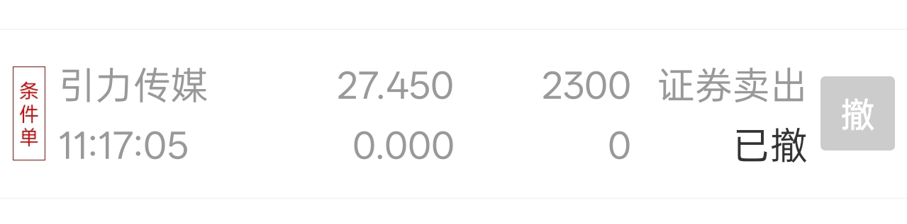 $引力传媒(SH603598)$ 靠,挂条件单涨停打开了就卖,居然没有触发,气死了