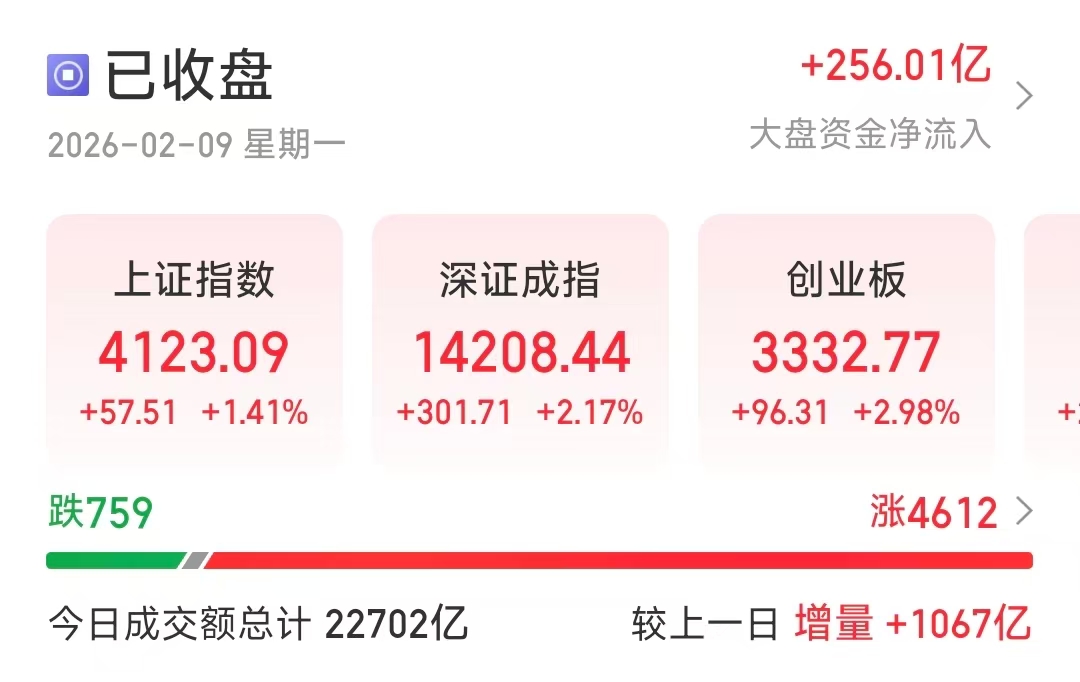【大河财立方消息】2月9日,A股三大指数高开高走,截至收盘,沪指涨1.41%,深证成指涨2.17%,创业板指涨2.98%。全市场成交额2.27万亿元,较上一个交易日放量1067亿元。