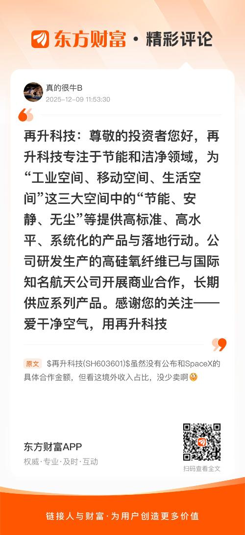 //@真的很牛B : 再升科技:尊敬的投资者您好,再升科技专注于节能和洁净领域,为“工业空间、移动空间、生活空间”这三大空间中的“节能、安静、无尘”等提供高标准、高水平、系统化的产品与落地行动。公司研发生产的高硅氧纤维已与国际知名航天公司开展商业合作,长期供应系列产品。感谢您的关注——爱干净空气,用再升科技