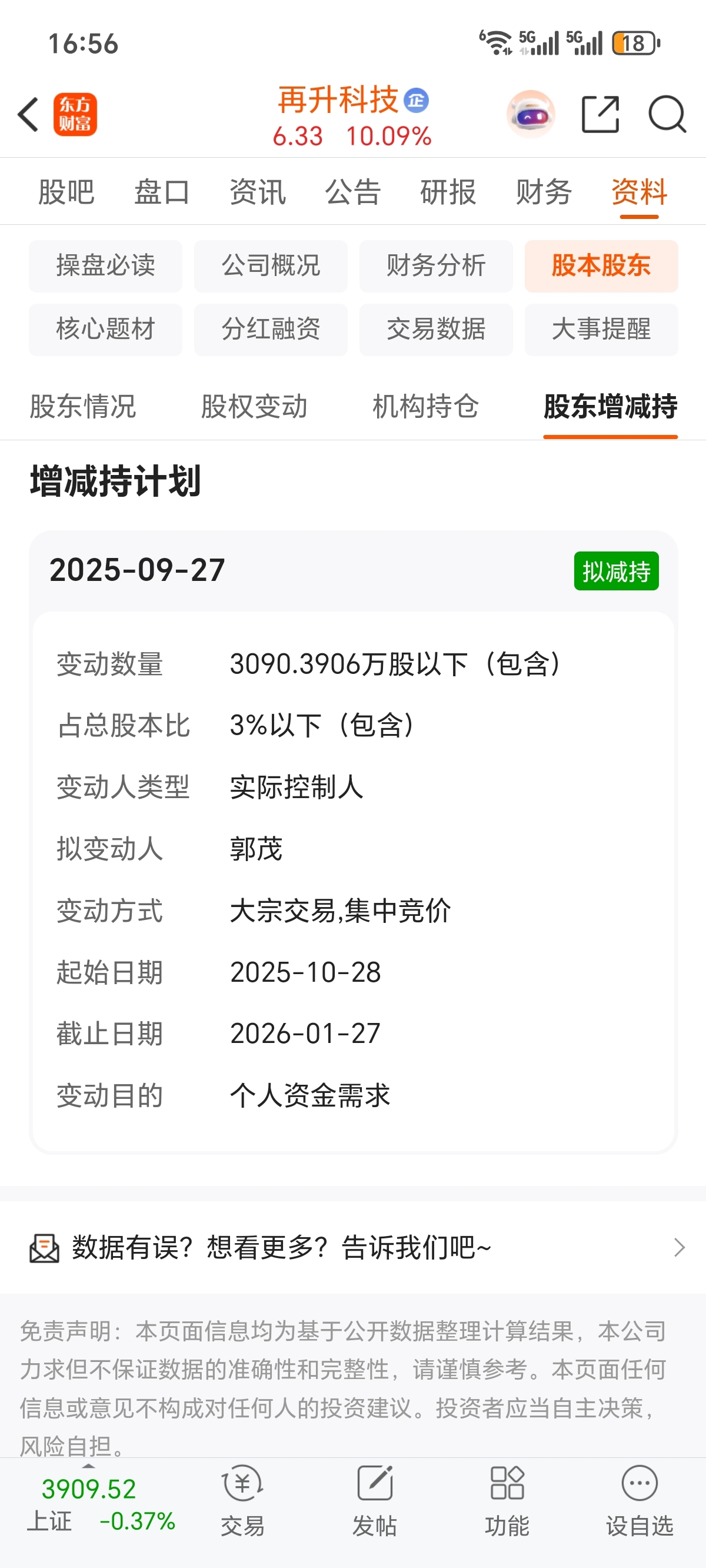$再升科技(SH603601)$ 这股最大的利空,就怕大涨,突然就减持了。