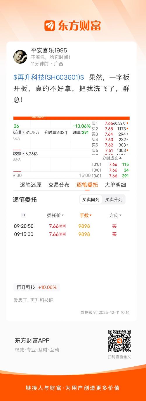 $再升科技(SH603601)$  果然,一字板开板,真的不好拿,把我洗飞了,群总!