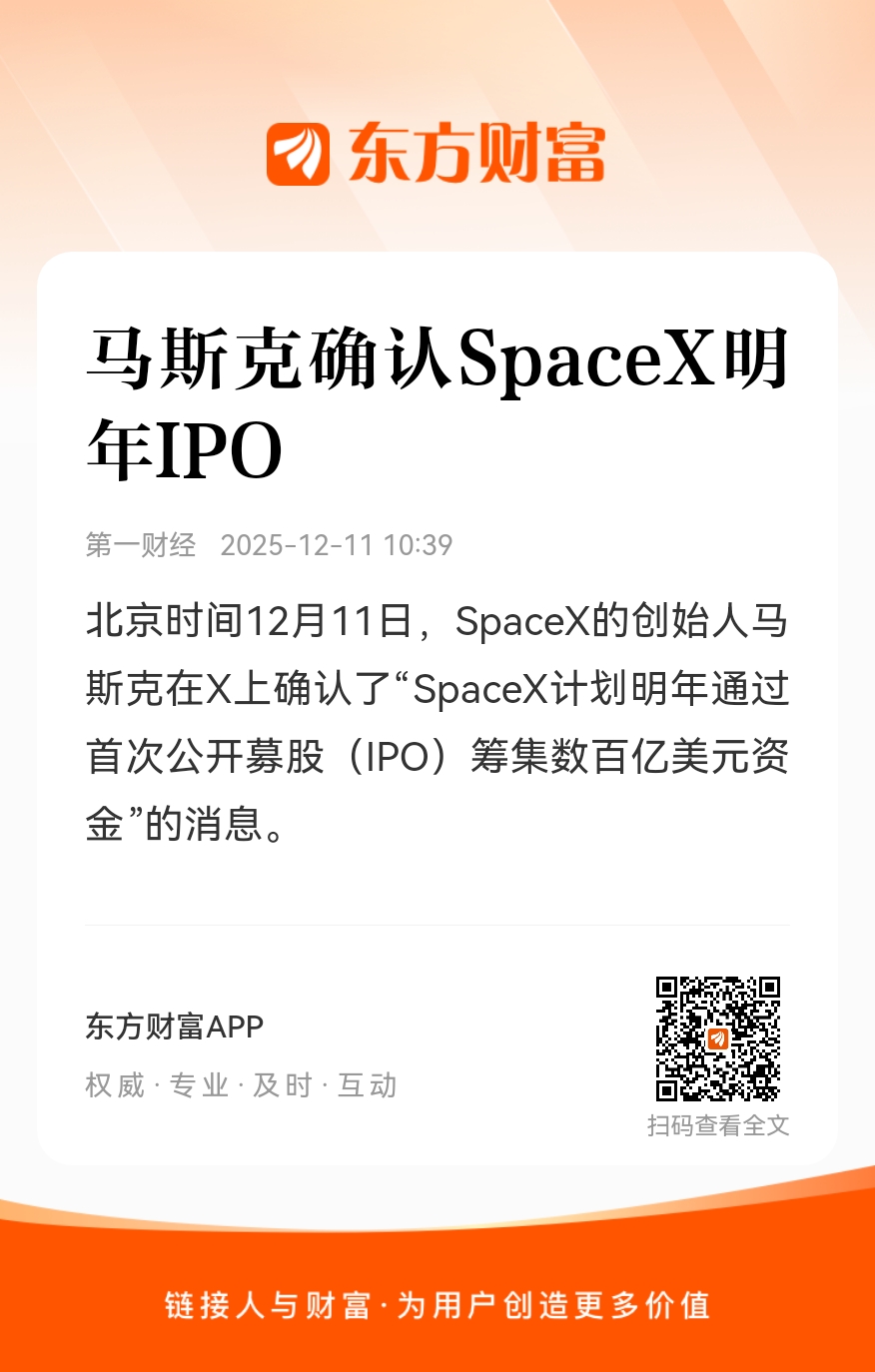 北京时间12月11日,SpaceX的创始人马斯克在X上确认了“SpaceX计划明年通过首次公开募股(IPO)筹集数百亿美元资金”的消息。
