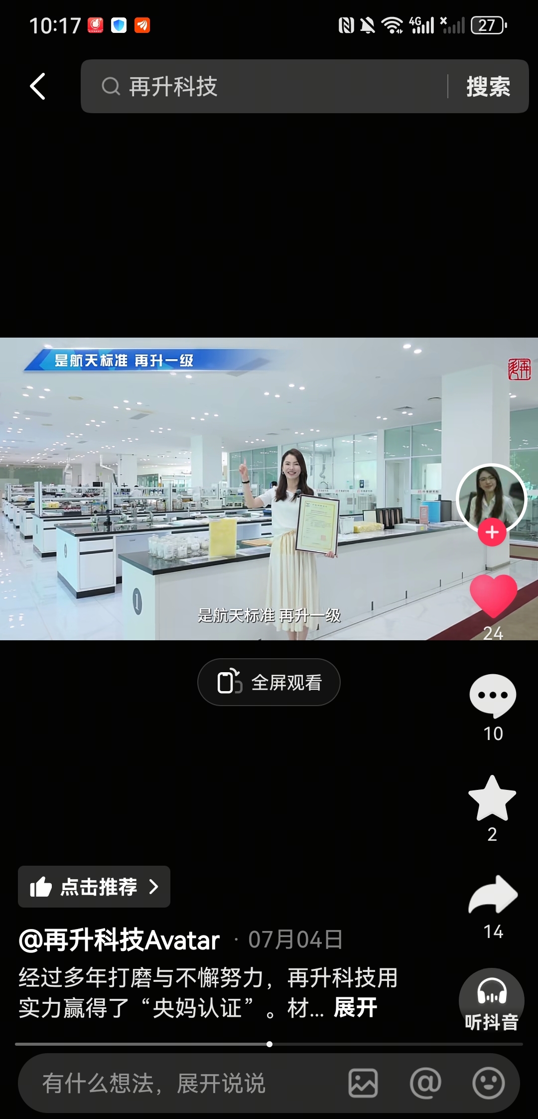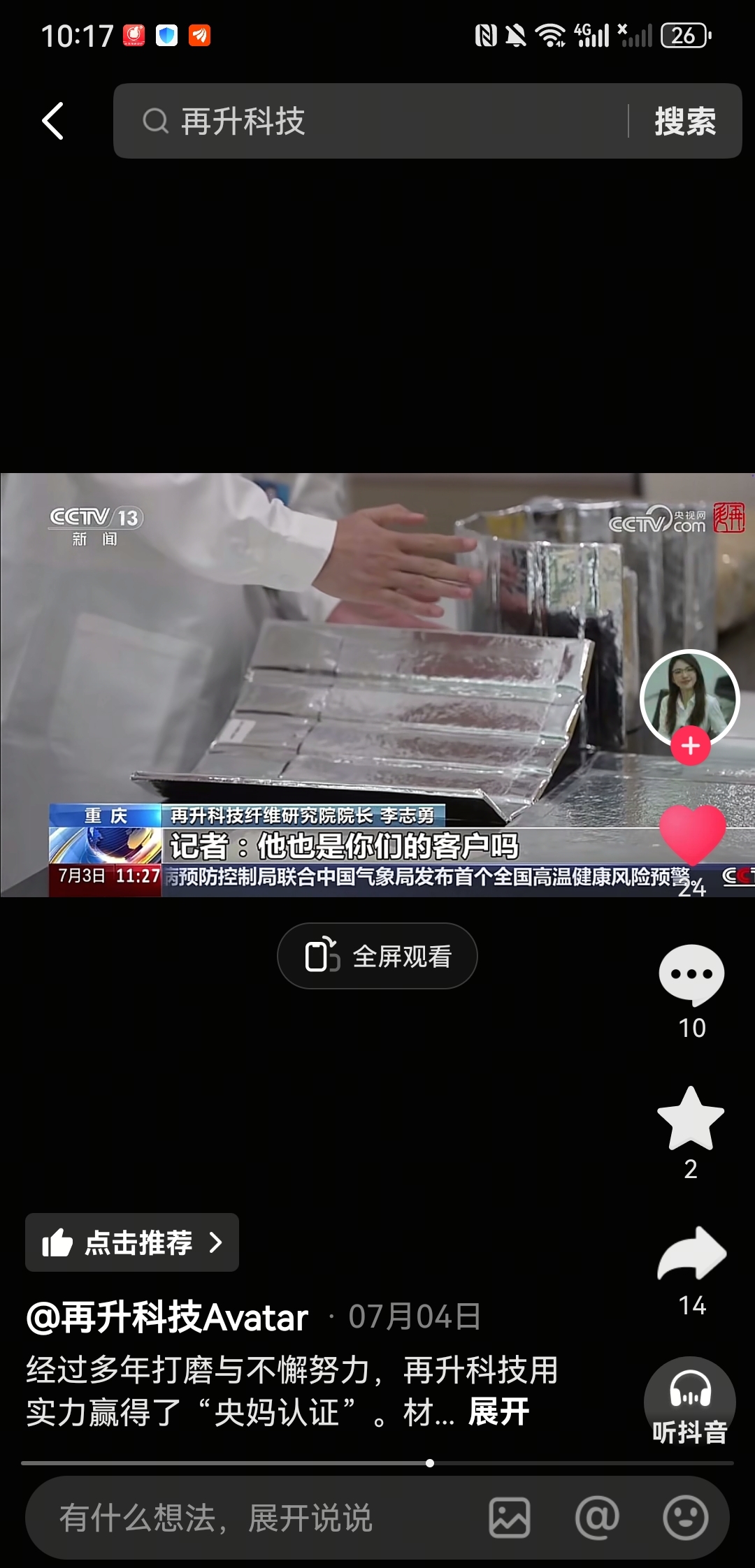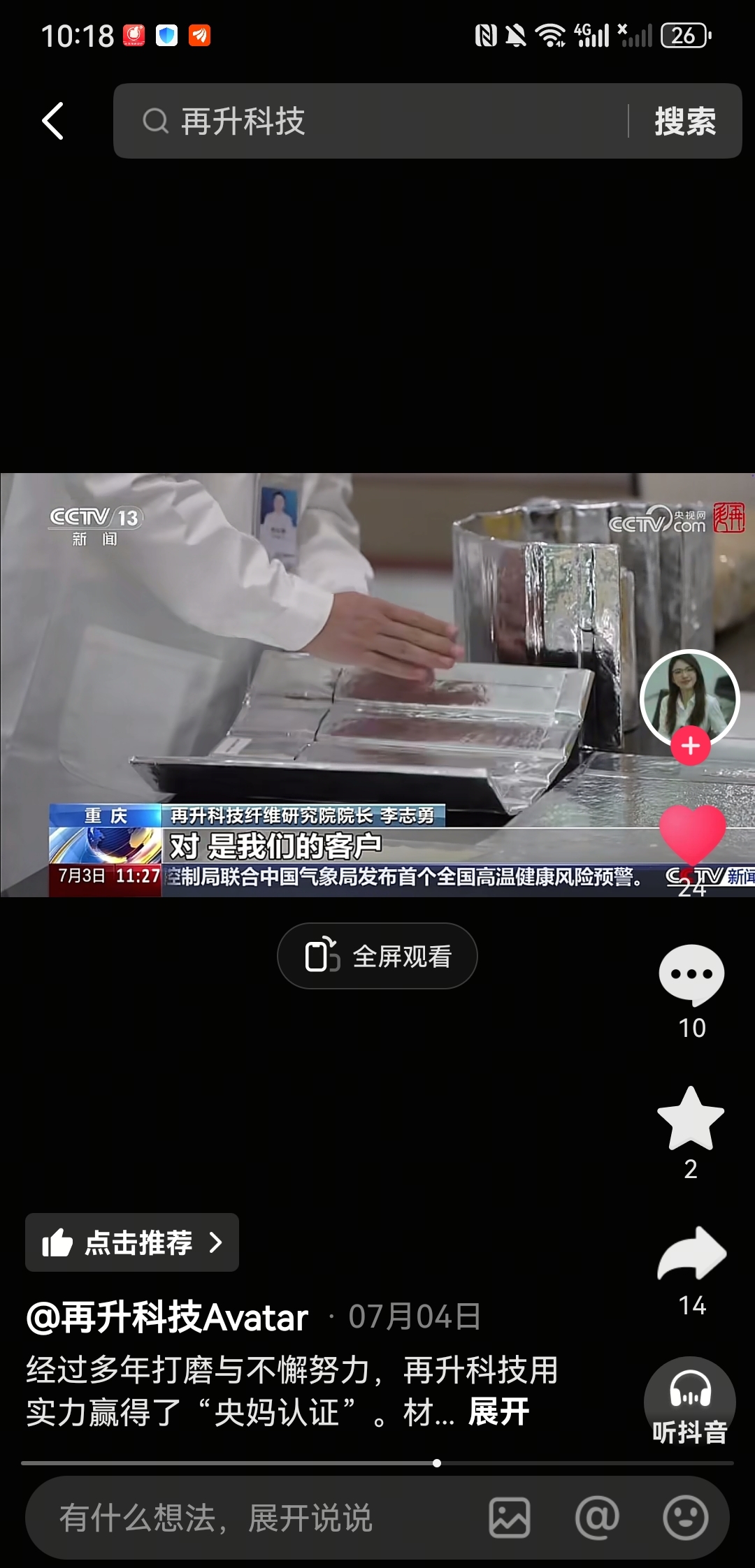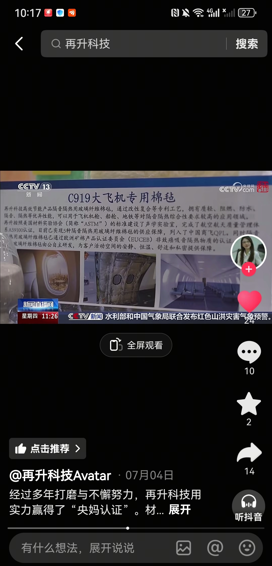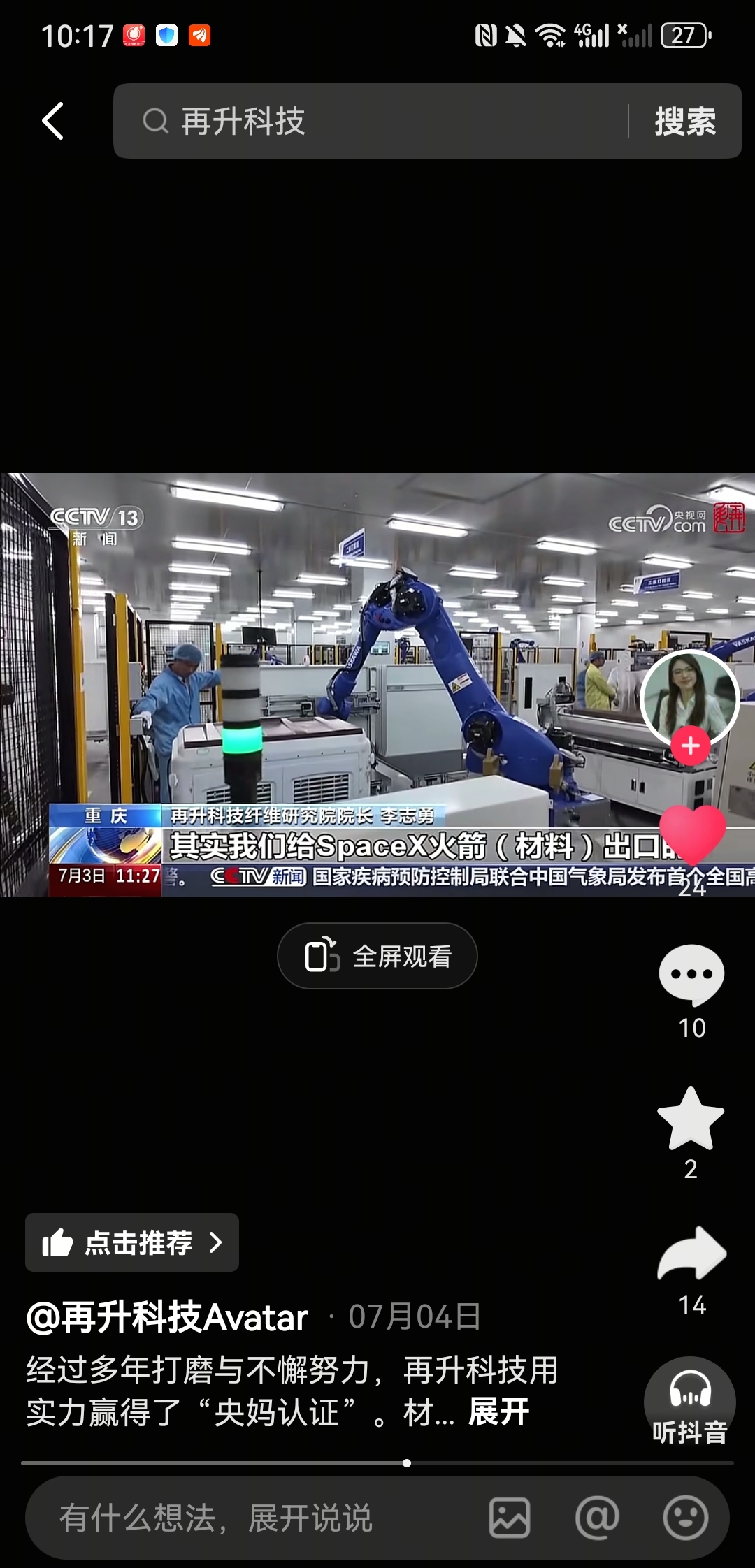 央视新闻记者采访,再升科技自己说的:产品应用于航空航天领域,且SpaceX是自己