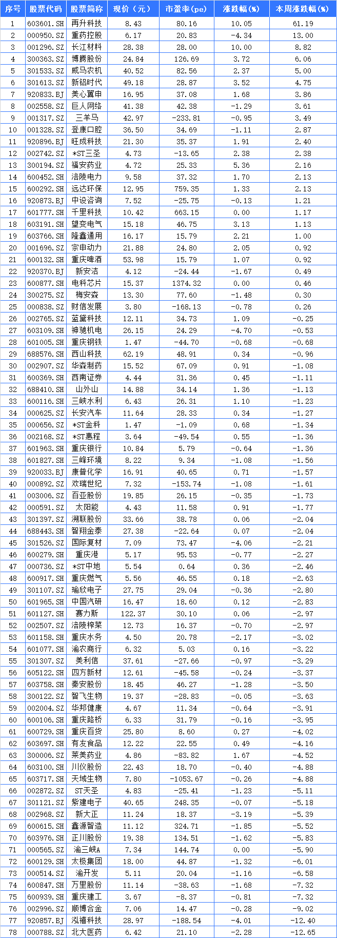 领涨的股票中,再升科技、重药控股和长江材料分别以涨幅61.19%、13.00%和8.82%,列重庆A股本周涨幅前三强。