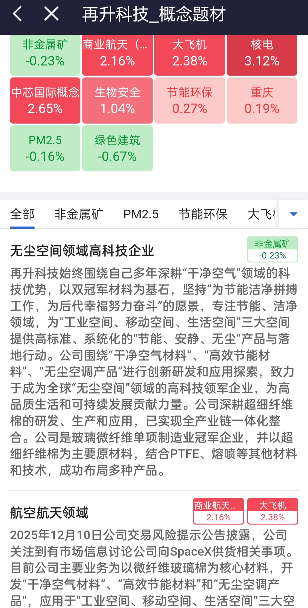 再升科技个股异动解析:SpaceX供应商+核电+控股股东拟转让股份+中芯洁净空气+玻璃微纤维+真空绝热板$振华股份(SH603067)$ $贵州茅台(SH600519)$