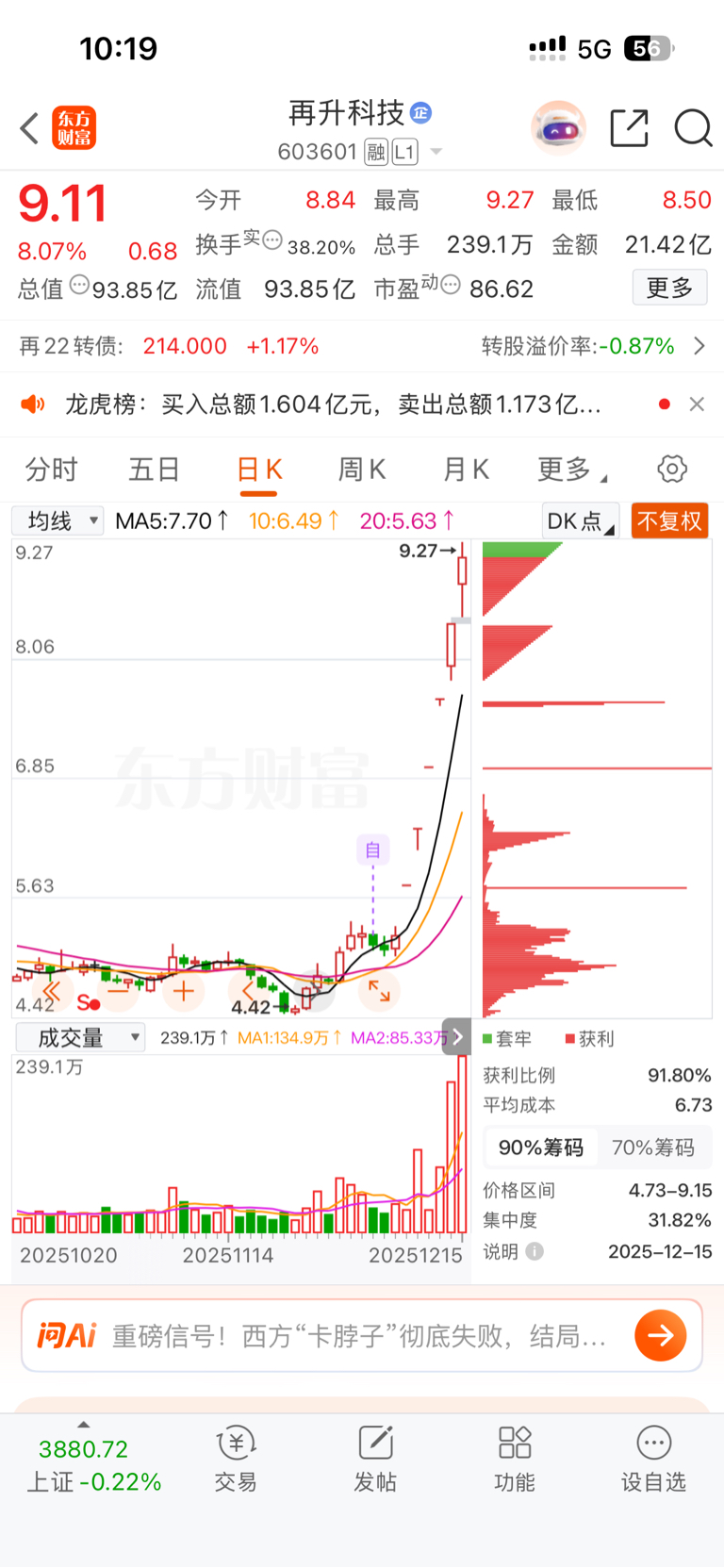 $再升科技(SH603601)$ 吃了6个多板,减仓了,0成本谢谢你