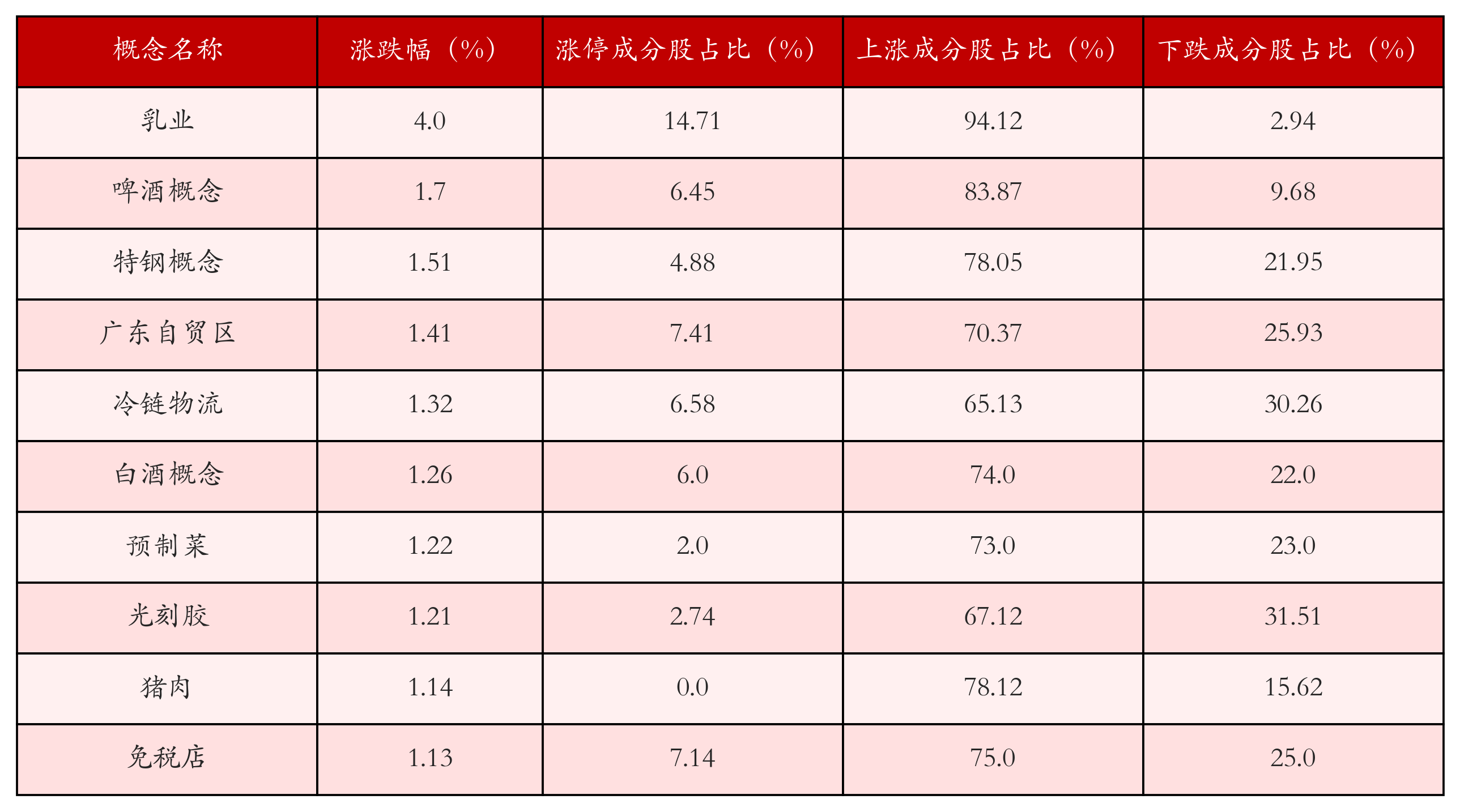 根据A股概念涨跌幅与所对应的股票池综合分析,涨幅靠前的三个概念板块分别为:乳业、啤酒概念与特钢概念。排名前10位的概念板块相关数据见下表: