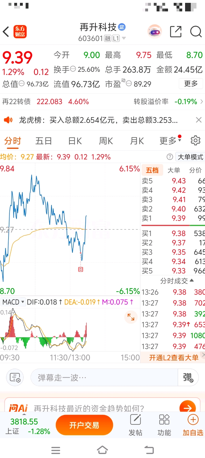 $再升科技(SH603601)$ 虾仁早上正在关注中这支,下午也是果断入场博弈,也算是十分的给力了,目前趋势还是非常不错的。
