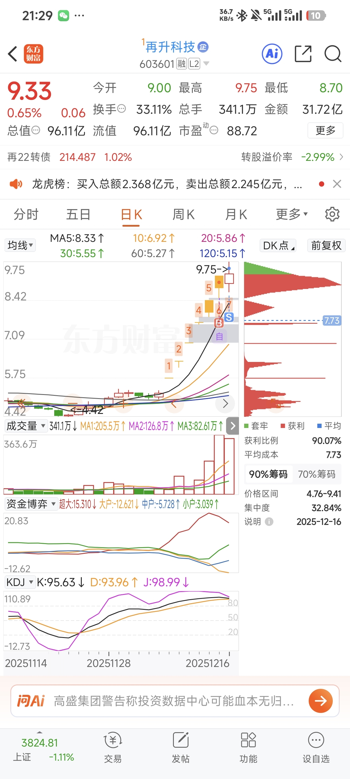 $再升科技(SH603601)$ #炒股日记# 高位风险大,快进快出