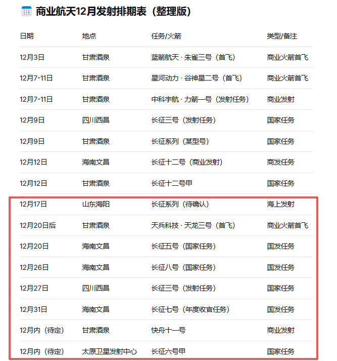 根据deepseek整理的商业航天12月发射排期,商业航天这条主线还没有走完!
