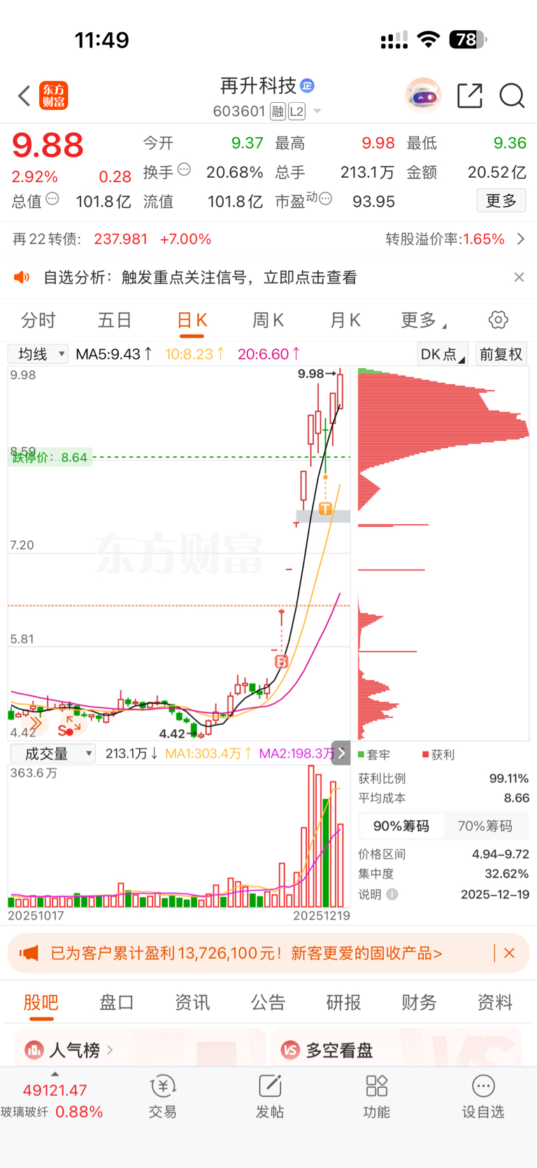 $再升科技(SH603601)$ 第二板进的,一直格局到现在,图形百年不遇的精彩,超越和富